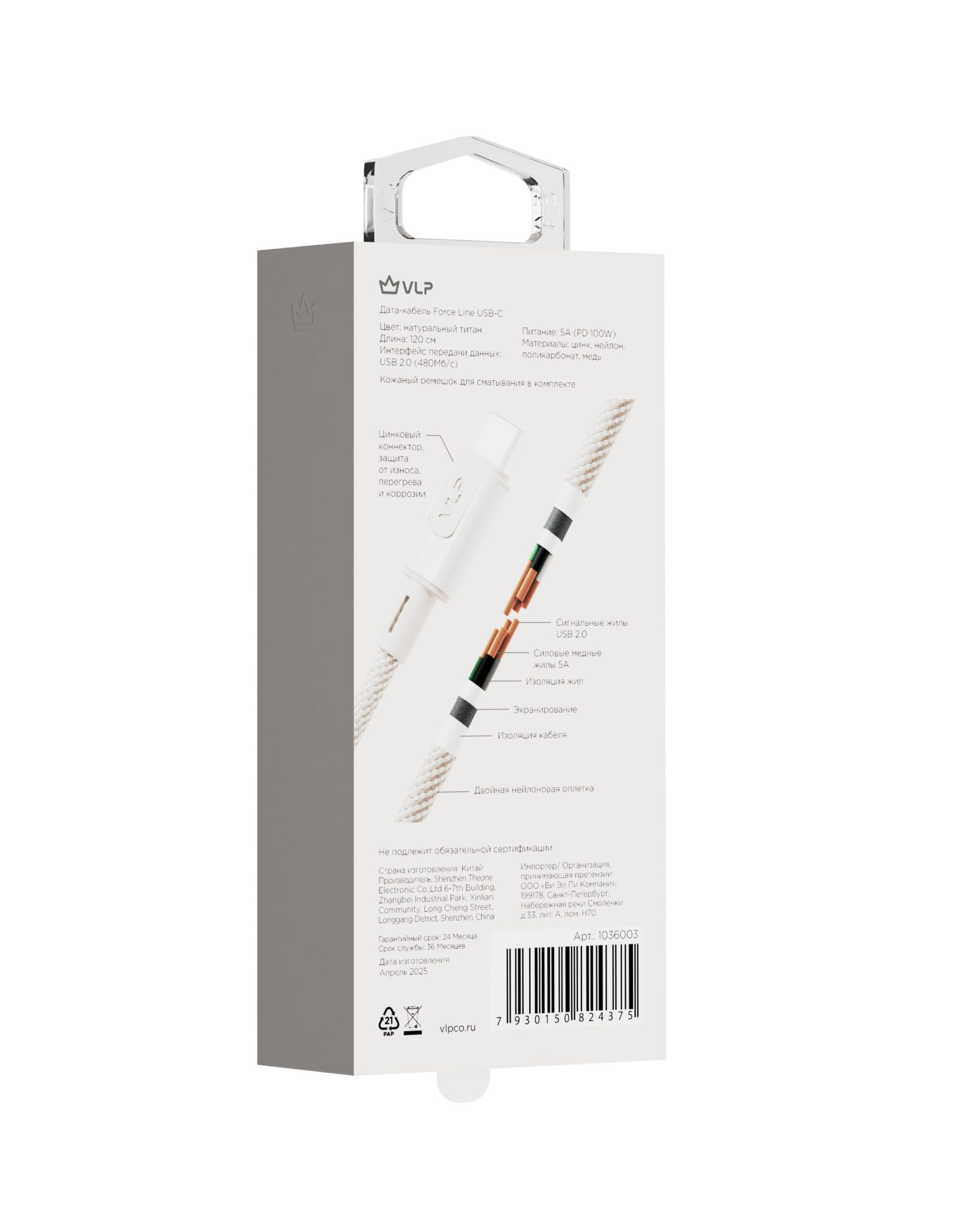Data cable VLP Force Line 100W USB-C + USB-C, 1.2m, natural titanium Force Line